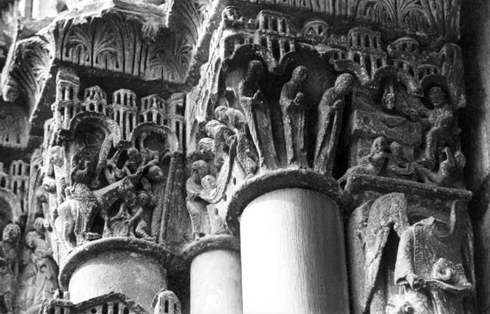 Chartres (F) - Cathédrale Notre-Dame: westgevel, Portail Royal, rechter portaal, kapitelen boven de linker beelden, direct naast de deur. Linker kapiteel: intocht in Jeruzalem (31). Midden: graflegging. Rechter kapiteel: verrijzenis