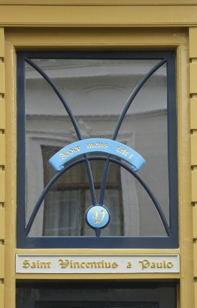 . Het bovenlicht van de ingang, recent voorzien van verwijzingen naar de in de 19e eeuw hier gevestigde Vincentiusvereniging.