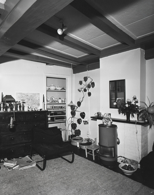 . Bijschrift: "woonkamer van de bovenwoning met moer- en kinderbintenplafond en schoorsteen."