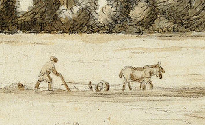 Opmerkingen: Collectie Het Utrechts Archief, cat.nr.27570. Dit detail toont het ploegen, met twee paarden, van een akker buiten de stadsmuur.