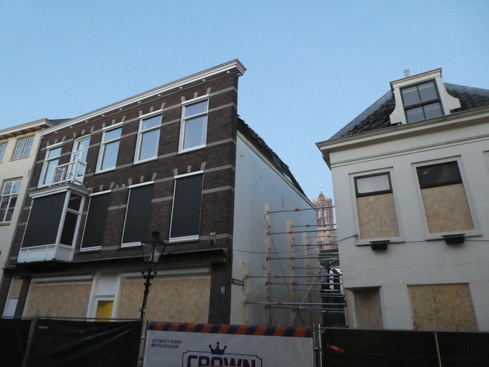 Op deze foto de hoekpanden van de Visscherssteeg, die ernstige schade hebben opgelopen