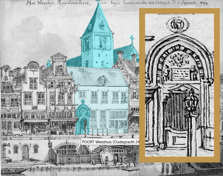 Omschrijving: Utrecht - Oudegracht 245 en omgeving. Uitgelicht: de poort van het Hervormde Weeshuis aan de Oudegracht, de hoofdingang van het Weeshuis Opmerkelijk is de grote overeenkomst met de achterpoort aan de Springweg.