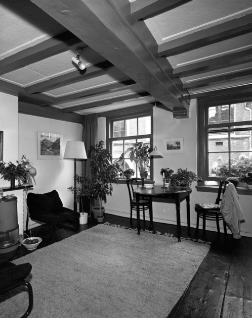 . Bijschrift: "woonkamer van de bovenwoning met moer- en kinderbintenplafond en ramen aan de voorzijde."
