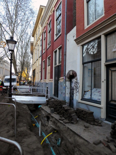 Op de Springweg wordt veiligheidhalve de hele gasleiding vervangen. Van rechts naar links: Springweg 4, Springweg 2, Poortje naast-, Springweg 2, en Mariaplaats 45. Op de achtergrond links Mariaplaats 27 (nu deel van Conservatorium).