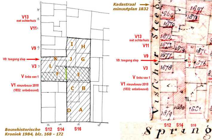 Omschrijving: Plattegronden Springweg 16 e.a. met duiding van onderzoek ABKU-1984/168-172. De bruine letters geven de ontwikkeling aan volgens Frans Kipp. Meest getroffen bij ontploffing 15-01-2026: vette adressen
