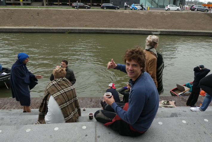 Op de trappen naast Muziekcentrum TivoliVredenburg één van de vijf zwemmers, net aangekomen na het zwemmen van zes kilometer, de hele singel rond. Ze zijn om 8 uur 's morgens vertrokken toen de singel nog niet heropend was en aangekomen na dat moment.