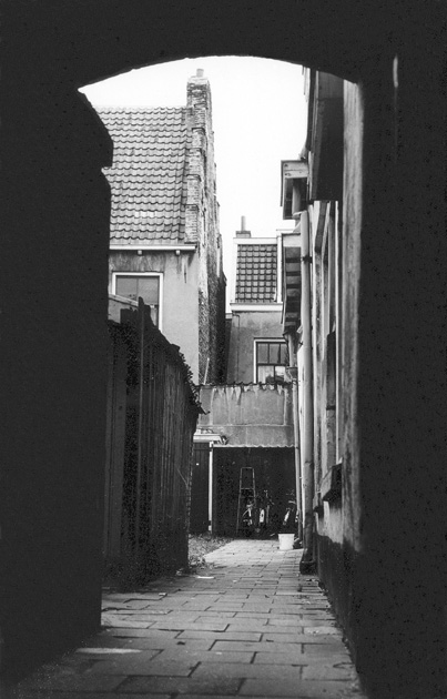 : doorgang onder Keizerstraat 21 naar het hofje. Op de achtergrond