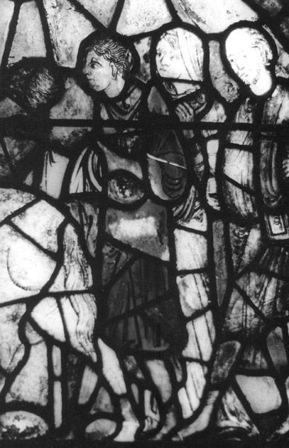 | opmerkingen : Canterbury (GB) - Cathedral: kooromgang oostelijk deel (Trinity chapel), zuidzijde, 4e raam van westen, onderaan, linker paneel, rechter stuk, 13e eeuw. Pelgrims op weg naar Canterbury (GB), detail, drie pelgrims (achter een ruiter) te voet