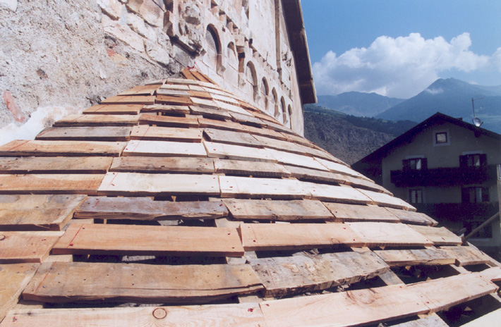 Lasa (= Laas, I) - San Giovanni Battista: aanbrengen nieuwe dakspanen op absis