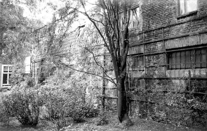 Utrecht - Ridderhofstad 4: westzijde, midden en noordelijk deel. Links:achtergevel en kap Herenstraat 31 en 29 (Herenhofje). Geheel links venster van achtergevel Herenstraat 25.