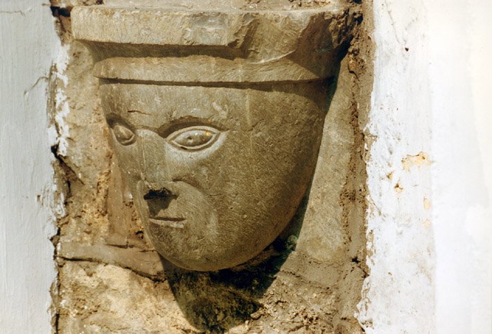 : crypte, oostwand noordelijke transeptarm, hergebruikte romaanse kop