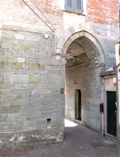 , geslachtstoren met publieksdoorgang. Op één steen links naast de hoek is een opening te zien. Dit is de uitmonding van een hemelwaterafvoer, die tot boven toe in de muur uitgespaard was.