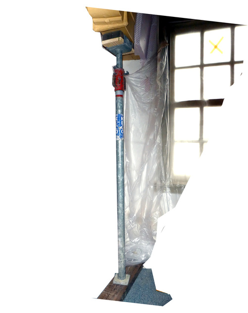 In verband met het herstel van de balkkop van de moerbalk aan de kant van de voorgevel is een stempel als stut geplaatst om tijdelijk het gewicht te dragen dat tot nu toe op de moerbalk rustte.