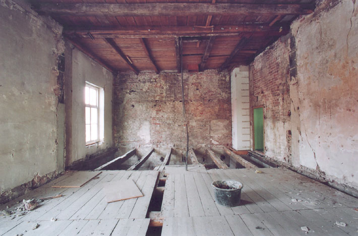 Harderwijk - Markt 1: linker middeleeuwse huis, verdieping, naar achter gezien. Vooraan de oorspronkelijk samengestelde balklaag (nu door tussenliggers enkelvoudig) evenwijdig aan de voorgevel. Achter enkelvoudige balklaag haaks daarop.