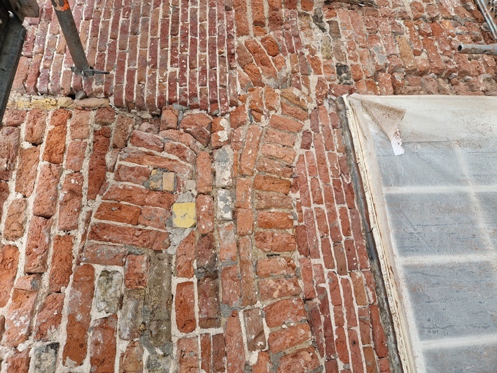 opmerkingen : Utrecht - Springweg 116. Het restant van de bovenste boog toont de plaats van de oude achterpoort van het Reguierenklooster. Van de rechter dagkant is onderaan het onderste duimblok bewaard gebleven, KLIK hier. Het restant van de onderste boog hoort bij de nisvormige ontlasting van het rond 1583 in de voormalige poortdoorgang geplaatste venster.