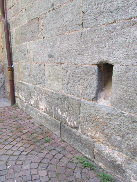 , geslachtstoren. Het gat is de uitmonding van een hemelwaterafvoer, die tot boven toe in de muur uitgespaard was.