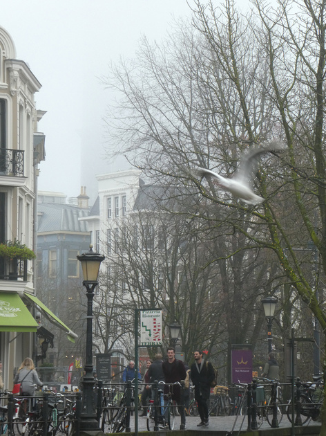Utrecht - Oudegracht naar het zuidoosten, met de Domtoren in de mist, of op z'n Utregs: 'de Dom is de Stad uit'.
