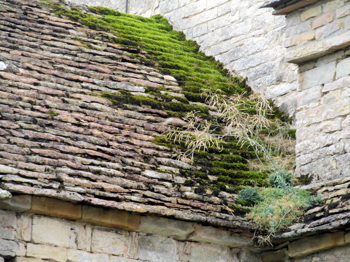 . De hoek tussen schip en transept, met natuurstenen dakbedekking (lauzes), waarop mos groeit.