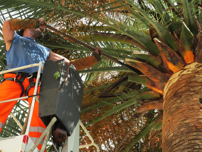 Onderhoud aan een palmboom: het afsnijden van palmtakken