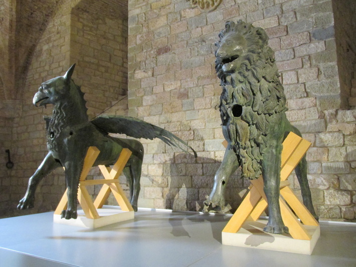Binnen staan de griffioen (links) en de leeuw (rechts), de bronzen originelen uit 1281 van de beelden aan de gevel.