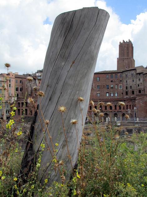 hoog uittorend boven het Forum van Traianus en de Mercati Traianei.