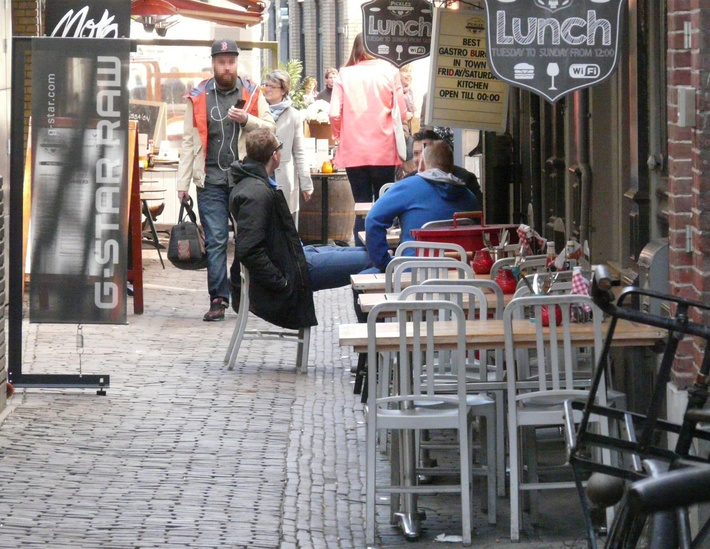 naar het westen: terrassen en uitstallingen.