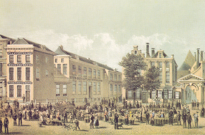 Gepubliceerd in: Wap, J.J.F. De Stad Utrecht, bevattende Afbeeldingen harer voornaamste Gebouwen en Gezigtspunten, met historische Bijschriften. Utrecht (Broese), 1860. Reprint: 's-Gravenhage (Kruseman) & Leeuwarden (Miedema), 1971. [164 blz. (er is geen doorlopende paginering) ISBN -], met als bijschrift: "Ganzenmarkt (Fruitmarkt)"