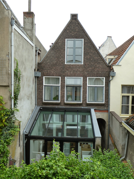 Rechts in de achtergevel van dat pand is te zien de doorgang van een slop: