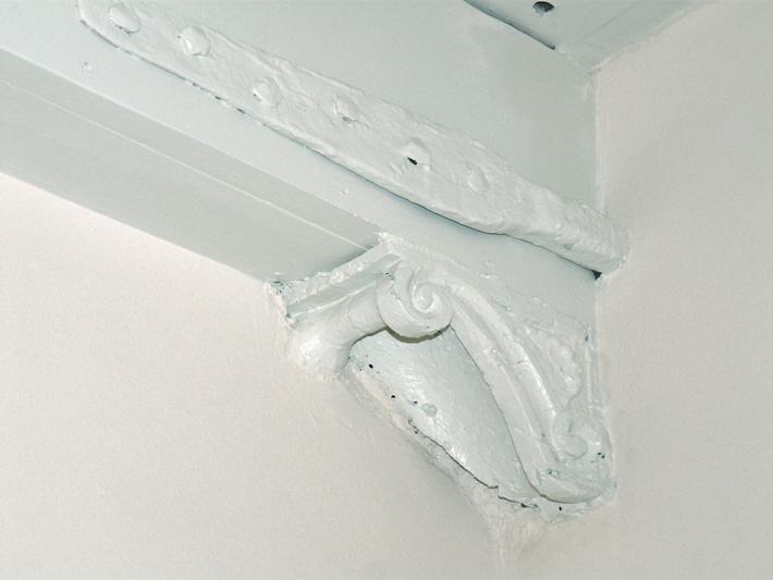 , 1e verdieping, zaal rechts. Strijkbalk-sleutelstuk, rechts tegen de achterwand, behorend bij de 17e-eeuwse verbouwing.