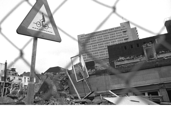 Utrecht - Smakkelaarsveld - Leidseweg 2, 'De Utrecht', restant voorgevel bij de hoofdingang tijdens de sloop. Het zwarte gebouw hoort bij 'De Utrecht' en ligt achter het hoofdgebouw. Op de achtergrond de hoogbouw van Hoog Catharijne (Radboudveste). Links achtergevels van de Catharijnesingel.